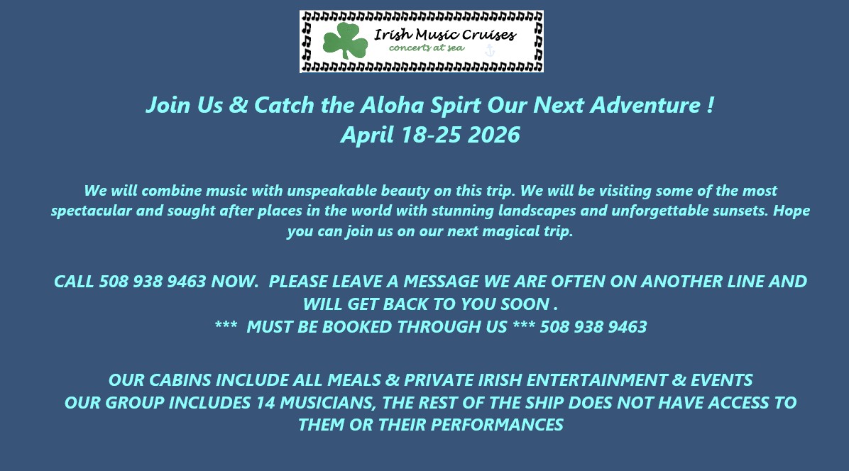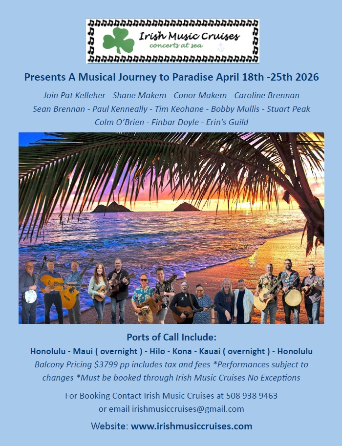 For more information and special deals, contact irishmusiccruises@gmail.com or call 1-508-938-9463